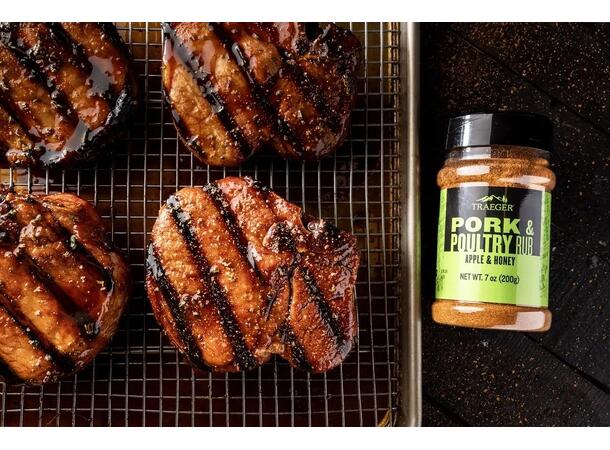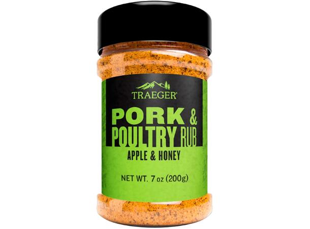 Traeger Pork & Poultry Rub er en smakfull krydderblanding som kombinerer sødme fra eple og honning med krydret paprika, løk og chili. Den er spesielt utviklet for å fremheve smaken av svinekjøtt og fjærkre, men passer også godt til andre milde kjøtttyper.